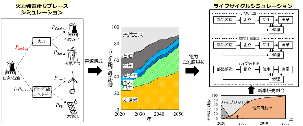 現実世界における人工物は、社会制度や社会規範、個人の行動選択等からも大きな影響を受けることがあり、これらすべてを単一の統合モデルで実装することは必ずしも好ましくない。そこで、ライフサイクルシステムの重要な外生要因に特化したシミュレーションモデルをライフサイクルシミュレーションと連成させるハイブリッド・シミュレーションを提案している[4]。例えば、カーボンニュートラル実現のために石炭火力発電を順次廃止して再生可能エネルギー発電に更新することが望まれる。本研究室では、国内の主要火力発電所のデータをもとにした電源構成リプレースシミュレーションとライフサイクルシミュレーションを組み合わせた研究により電力セクターが乗用車セクターに与える影響を評価している(図6)[7]。