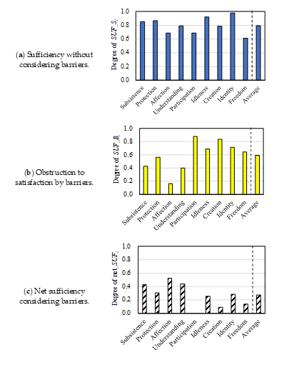 本アプローチに基づいて生活圏全体の工業製品による正味の基本ニーズ充足性を評価するモデルを開発し、特定地域を対象に評価した事例がある[10](ただし、ニーズ充足に対するサービスや非物質的な存在(例えば家族)の貢献は評価範囲外である)。図9は大阪住民を対象とした評価例であり、日常生活で使用する製品の機能によって基本ニーズはそこそこ満たされるものの、製品の機能がむしろ基本ニーズ充足を妨げる悪影響も加味した結果、参加、創造、自由という基本ニーズ対する正味充足度は大きく低下することが示された。